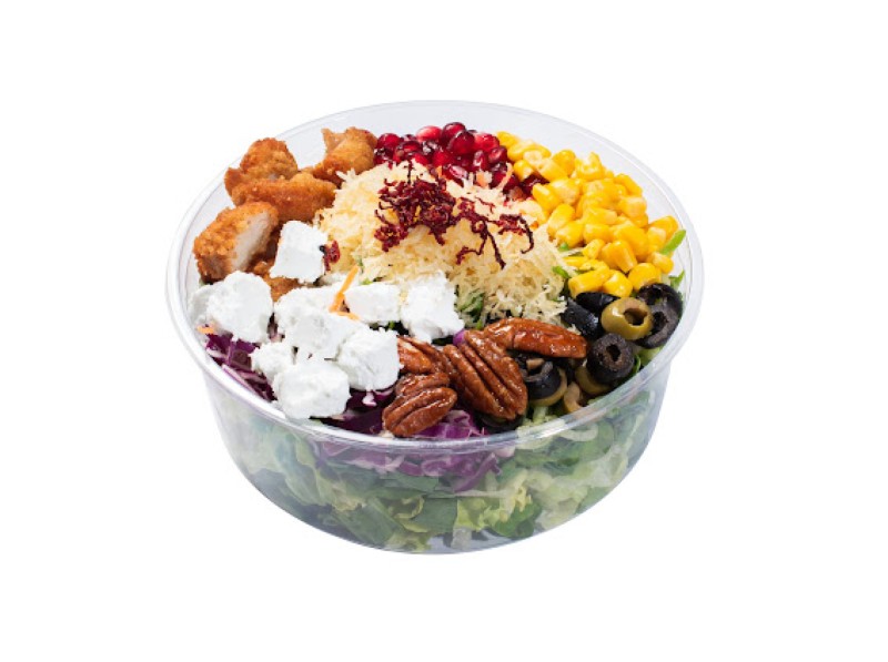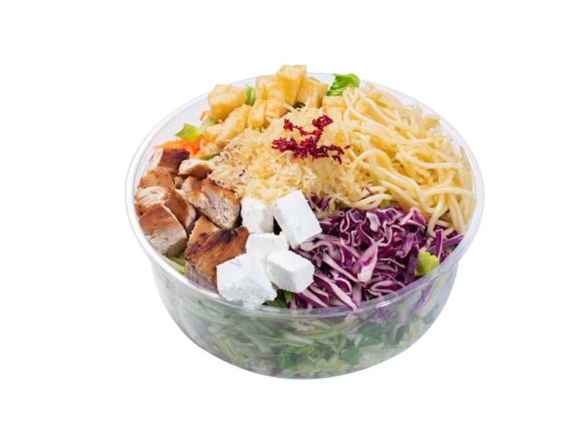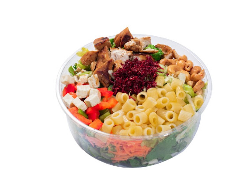 (220 سعرة حرارية) 55 دقيقةخس - جرجير - خيار - جزر - خس امريكي - فلفل رومي - دجاج مشوي - جبن حلومي - مكرونه صغيرة - كاجو - بطاطس مبشور